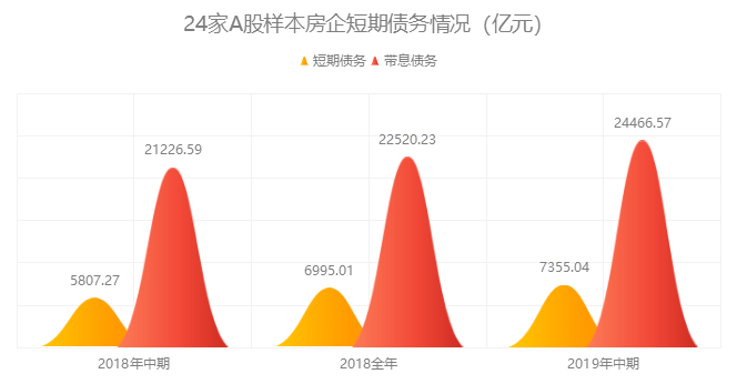 24家A股样本房企,2019年中期的带息债务为24466.57亿元,短期债务为7355.04亿元,占比30%,2018年同期该比率为27%。