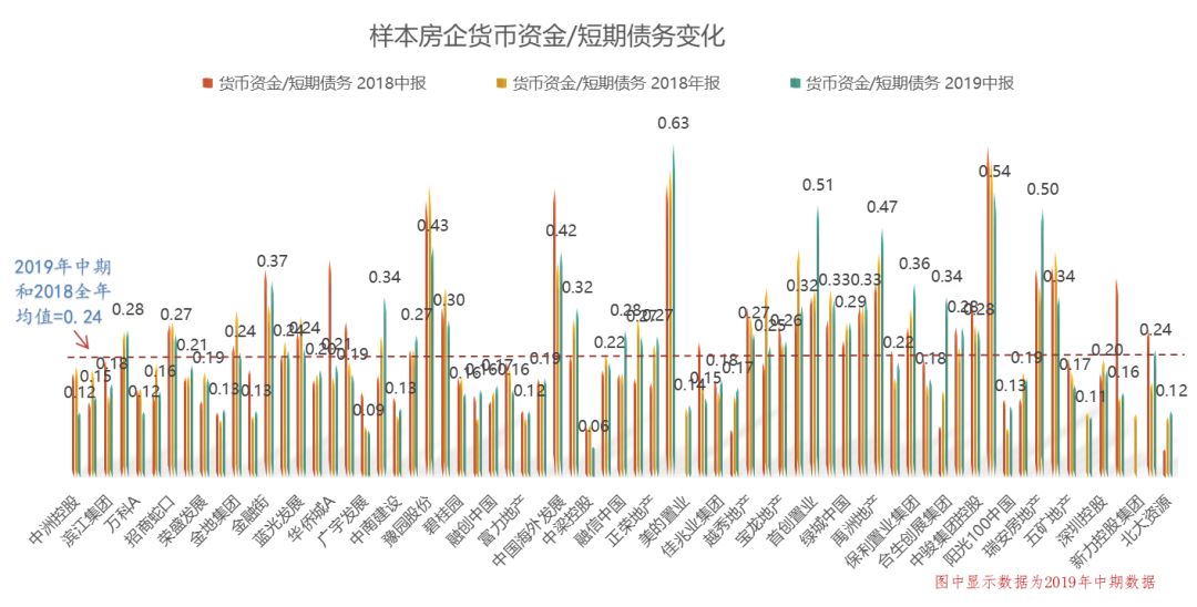 观点指数以68家样本上市房企作为监测样本(24家A股,44家内房股),可以看到2019年中期货币现金/短期债务的平均比率为0.24,与2018年全年相等,同比2018年中期下降0.01。