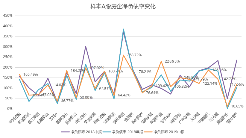 净负债率方面,24家A股样本房企2019年中期的平均净负债率为127.33%,高于平均线的有11家,最高为258.72%,低于平均线的有13家,最低的为10.65%。另外需要留意的是,有7家房企2019年中期的净负债率较上年同期出现上升,有一家的上涨幅度达到131.01%。