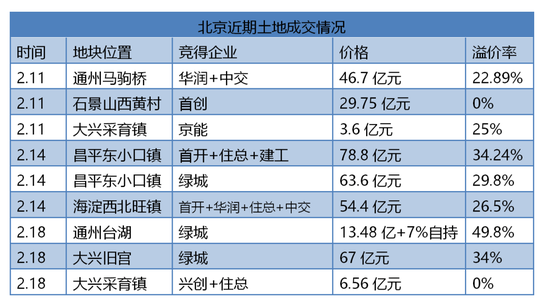 2月18日,北京通州、大兴三宗不限价地出让,吸引了包括住总、越秀、中海、石榴、华发、卓越、旭辉、金地、龙湖、绿城、首开+保利、金茂、雅居乐在内20余家房企参与。