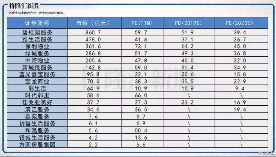 可以看到,龙头中碧桂园服务、保利物业、绿城服务、新城悦等企业的估值已不低。但是,正是受益于企业本身的高成长性(预期50%以上的业绩增速),这些优质物业公司PE(2020E)区间或能达到50-60倍。