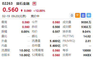 在昨日暗盘交易中,富石金融控股收盘涨16%,最新总市值5.8亿港元,成交额3340万港元,若按收盘价卖出不计手续费一手赚800港元。