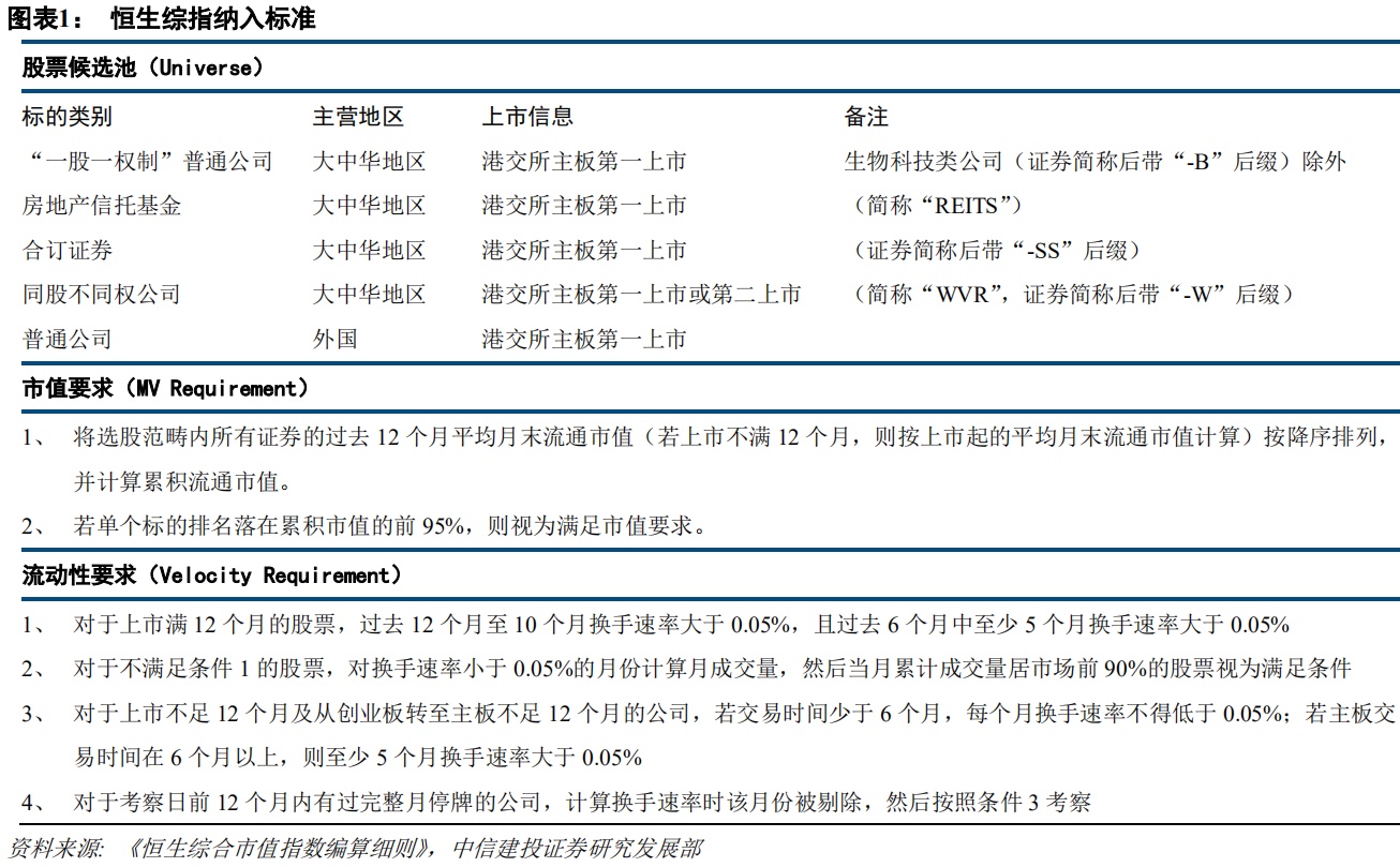 根据最新恒生综指的编制手册,恒生综指的标的股票纳入标准如下表: