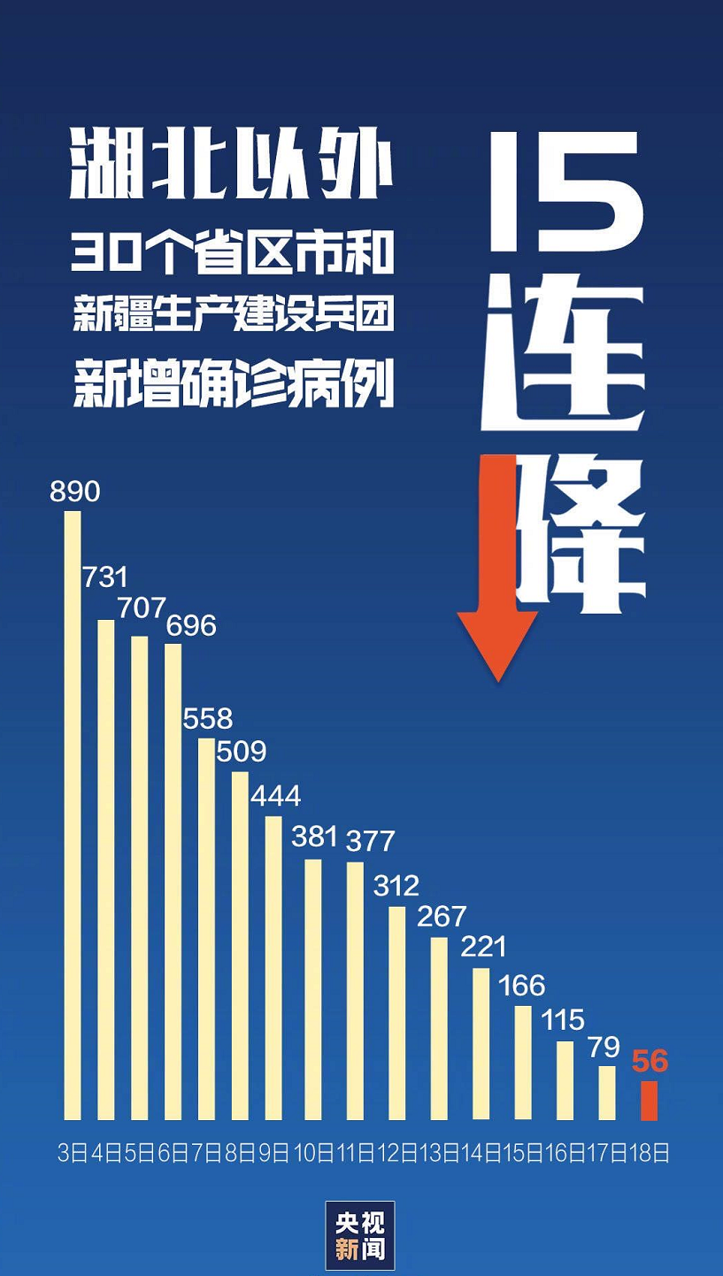 根据国家卫健委数据统计,在2月18日0-24时,全国除湖北以外地区新增确诊病例为56例,连续15天呈现下降趋势。同时这天全国新增治愈出院病例为1824例,首次超过了全国新增确诊案例数1749例。