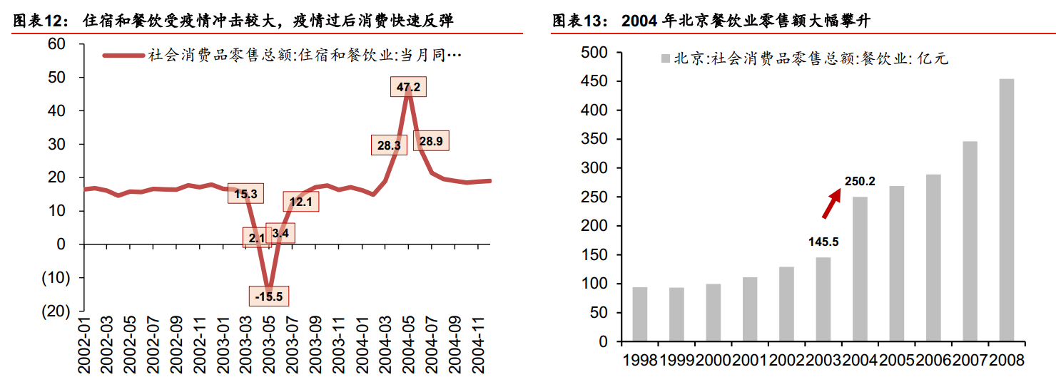 全国住宿和餐饮业的零售额从 2003 年 4 月开始增速滑坡, 5 月出现负增长,但从 7 月起就恢复了正常增速, 2004 年的增速更是大幅攀升。以受 SARS 疫情较重的北京市为例,餐饮业零售额从 03 年的 145.5 亿元上升到 2004 年的 250.2 亿元,增幅超过七成。