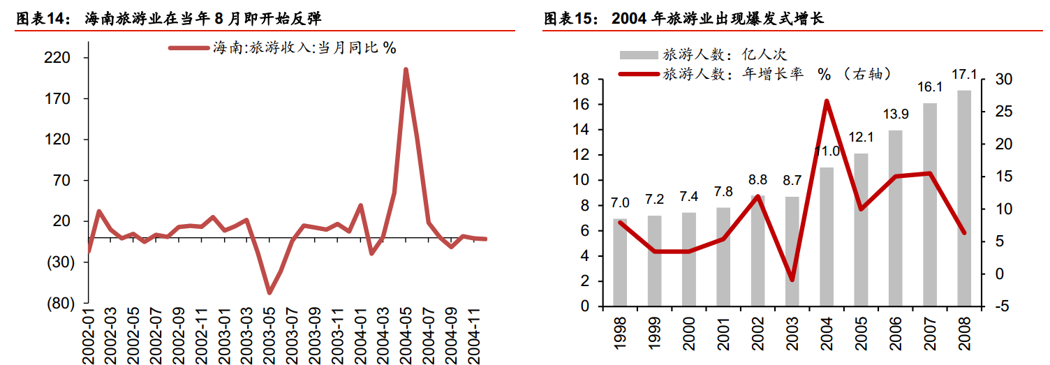 海南旅游业是全国旅游业的一个缩影, 2003 年国内旅游人数出现了小幅萎缩,但却触发了 04 年旅游业的爆发式增长。