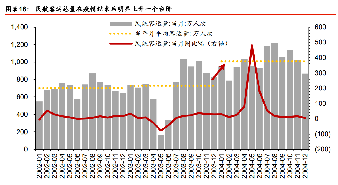 航空运输在 SARS 疫情控制住之后也出现了补偿性增长。 03 年 5-6 月,民航客运量降至冰点, 7 月开始反弹, 8-12 月民航客运量明显上升了一个台阶,四季度同比增速达到了24.9%,月均客运量从疫情开始前的每月约 700 万人次上升到每月约 1,000 万人次。
