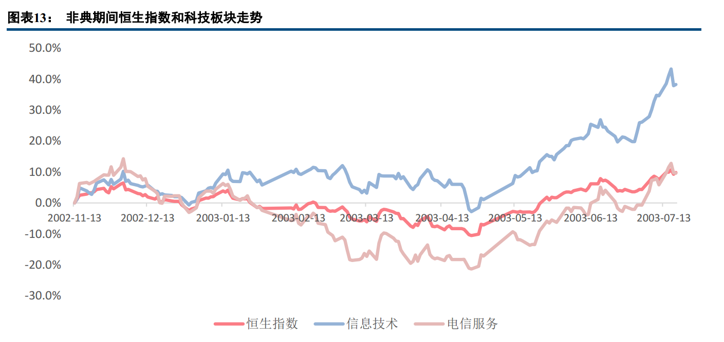 在非典疫情爆发期间, 自 2003 年 3 月底至 4 月底,恒生指数累计回调 8.5%, 4 月下旬至 6 月中旬,恒生指数反弹并创年内新高,其中港股信息技术板块在非典时期跑赢大盘,在疫情期间抗跌性强,未受明显影响。