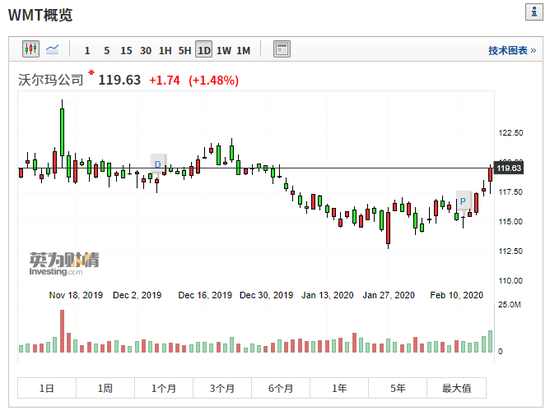 周二,沃尔玛公布的业绩并不如人意,但是华尔街似乎已经原谅了它,仍然坚定不移地看好公司的后市前景。虽然受到假日季线下销售的疲软拖累,沃尔玛业绩不及市场预期,但是,截至周二美股收盘之时,沃尔玛仍然收涨1.48%,报119.63美元,市值为3394亿美元。
