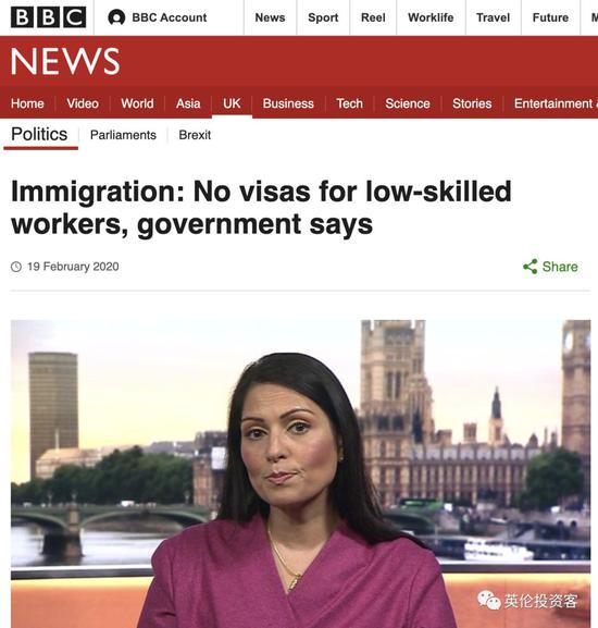 “我们的新移民制度将对廉价且低技能的劳工关上大门,我们未来将重点吸引全球最聪明的人,以促进经济发展,并释放英国的全部潜力。“