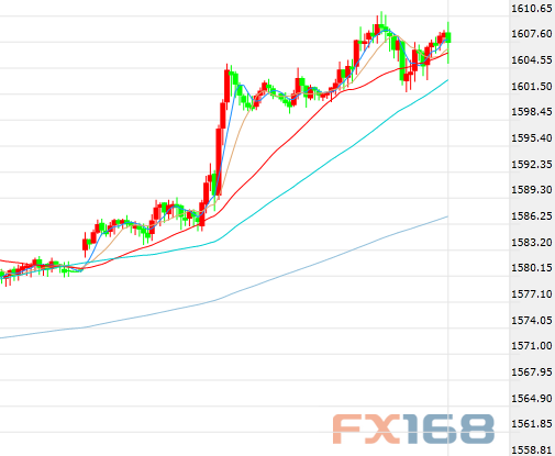 现货黄金短线下跌,15分钟内波动近4美元,现报1606.20美元/盎司。