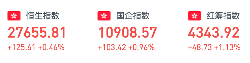 恒生指数开盘跌0.16%,盘初急升超150点,随后维持窄幅震荡。截至收盘,恒生指数涨125.61点或0.46%,报27655.81点,全日成交额达883.61亿。国企指数涨0.96%,报10908.57点,红筹指数涨1.13%,报4343.92点。