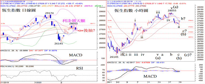 以(a)浪升幅的0.382及0.5倍回吐幅度計算,支持位27326及27100。另一個可行的數浪式是:五個浪所組成的(a)浪在2月13日的27953見頂,後的(b)浪以「不規則形」或稱為「3-3-5」的方式調整至今早的27448見底,目前是(c)浪上升的起步階段,恆指將會逐步重現升勢。如果恆指今日能夠重返27740的50天平均線之上高收,則表示此數浪式較為符合實際市況發展。