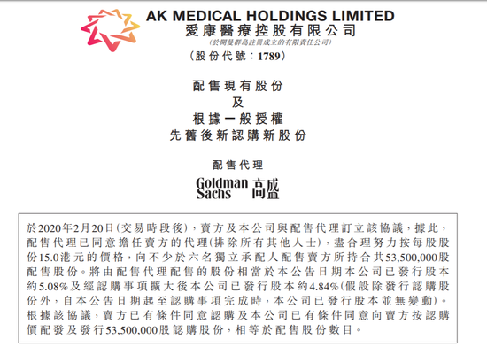 2月21日消息,爱康医疗(01789)发布公告,于2020年2月20日,卖方喜马拉亚有限公司及公司与配售代理订立该协议,据此,配售代理已同意担任卖方的代理(排除所有其他人士),尽合理努力按每股股份15.0港元的价格,向不少于六名独立承配人配售卖方所持合共5350万股配售股份。将由配售代理配售的股份相当于公告日期公司已发行股本约5.08%及经认购事项扩大后公司已发行股本约4.84%。