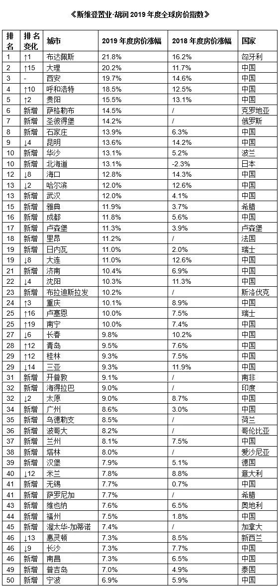 从全球来看,匈牙利布达佩斯跃居全球房价涨幅第一,过去一年涨幅达21.8%,其在2018年度涨幅为16.2%,位居全球第二。美国2019年没有城市上榜,相比2018年同期减少10个。