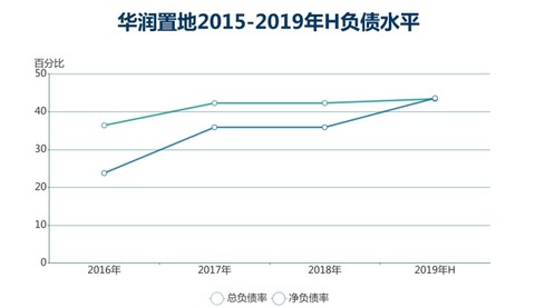 2019年上半年,华润置地总有息负债率43.4%,过去三年分别是36.4%、42.3%、42.3%;净有息负债率43.6%,过去三年分别为23.8%、35.9%、47.2%;平均融资成本为4.45%,过去三年分别为4.23%、4.16%、4.47%,是国内融资成本最低的房企之一。