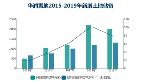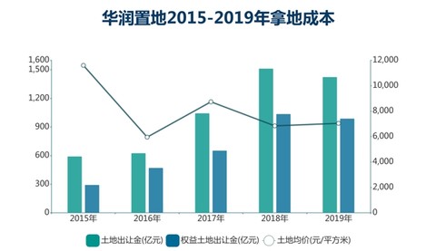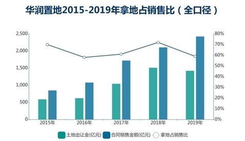 至2019年,华润置地拿地金额有所下滑,土地权益价988.8亿元,同比下降4.6%,但拿地占销售比仍在58%以上,远高于土地投资额榜首的万科(控制在30%-40%)。