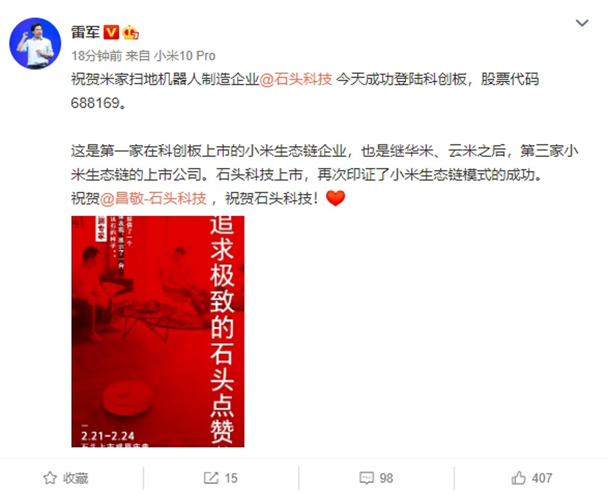雷军在微博上表达了祝贺,并表示这是第一家在科创板上市的小米生态链企业,也是继华米、云米之后,第三家小米生态链的上市公司。石头科技上市,再次印证了小米生态链模式的成功。