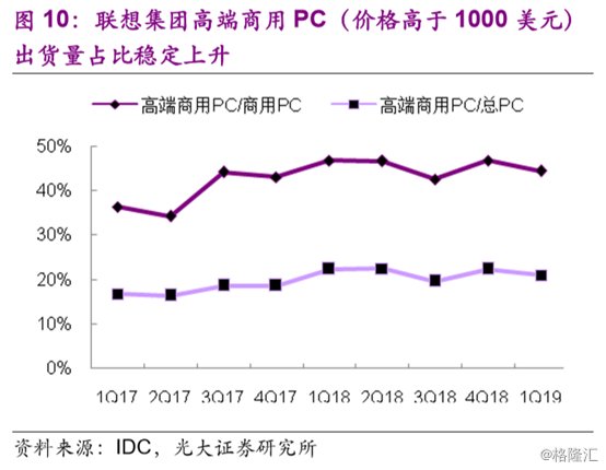 从行业景气度回暖及高端PC占比持续提升的趋势来看,联想在去年第三财季凭借高端PC拉升溢利率的逻辑在今年年内应得以延续。而联想亦在顺应该行业的发展趋势调整经营方向。统计品牌过往年间的产品发展,联想的高端商用PC占总PC出货量比例同样在持续增加。