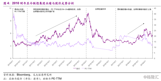 估值方面,回顾联想在往期的业绩及估值表现:公司在2015年至2017年经历了一波估值、业绩双杀。其原因包括PC业务受行业整体低迷影响出现营收下滑,移动业务亏损增加,及收购摩托罗拉移动和 System X等产生较多一次性支出等因素。