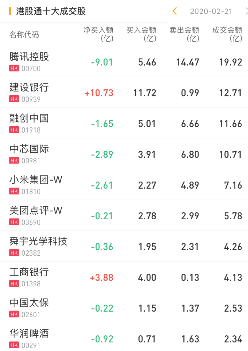 今日净卖出腾讯控股9.01亿港元,净卖出小米集团2.61亿港元,净买入建设银行10.73亿港元,净买入工商银行3.88亿港元。