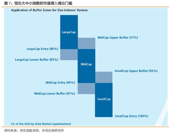 2)恒生中型指数:将新调整后的恒生综指所有公司12个月平均流通市值加总后,原来已在中型指数的标的,如果本次低于97%则被调出,如果在77%-80%则调入大型;如果在95%-97%中,则调为小型;原来不在恒生综指中的公司,如果市值在77%-93%之间则可进入中型指数;