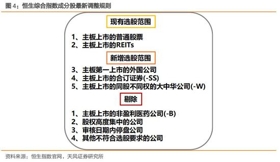 目前恒生综指有五大选股准则:1)主板上市的普通股票;2)主板上市的REITs;3)主板第一上市的外国公司;4)主板上市的合订证券(-SS);5)主板上市的同股不同权的大中华公司(-W)。