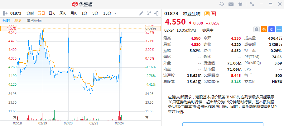恒生指数公司宣布季度恒生指数系列检讨结果。维亚生物(01873)获纳入恒生综合指数、恒生医疗保健指数、恒生港股通指数、恒生港股通中小型股指数、恒生港股通小型股指数、恒生港股通非AH股公司指数以及恒生港股通香港公司指数,生效日期为2020年3月9日 (星期一) 。受消息影响,维亚生物高开高走。截至发稿,涨7.82%,报4.55港元,成交额1809万港元。