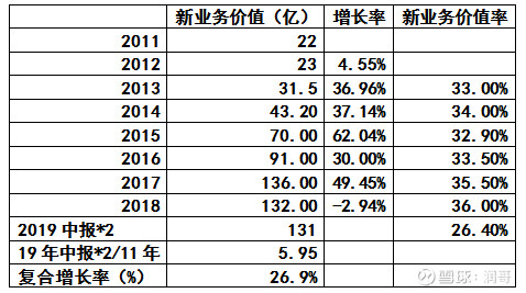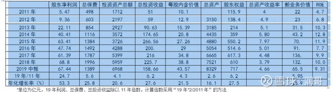 从11年-19年中报,利润增长24倍,平均年化53%,保费增长5.6倍,平均年化25.8%,可投资资产增长4.1倍,平均年化投资收益增长20.6%,总投资收益,增长6.2倍,年化增长27.6%,每股内含价值增长4.3倍,年化增长为21.5%;总资产增长2.6倍,平均年化16.1%。股东权益增长6.2倍,年化27.5%。新业务价值增长5.95倍,平均年化26.9%。股东权益增长6.2倍,年化27.5%。此外,据说太平18年剩余边际1300亿,非常出色。