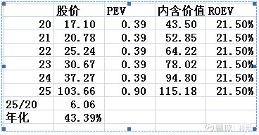 17年是太平新业务价值增幅较大时候,假设17年的业务在7-8年也就是2025年利润释放,ROEV保持原来均值21.5%,同时赶上牛市,利润大爆发,进入利润释放期,股票估值恢复到0.9倍Ev,内含价值增加到 115,那么股价,103,那么5年化业务回报如下表。5年回报率年化43%。不过这算法是有点想当然。不是投资建议,大家千万别听,就当个笑话。
