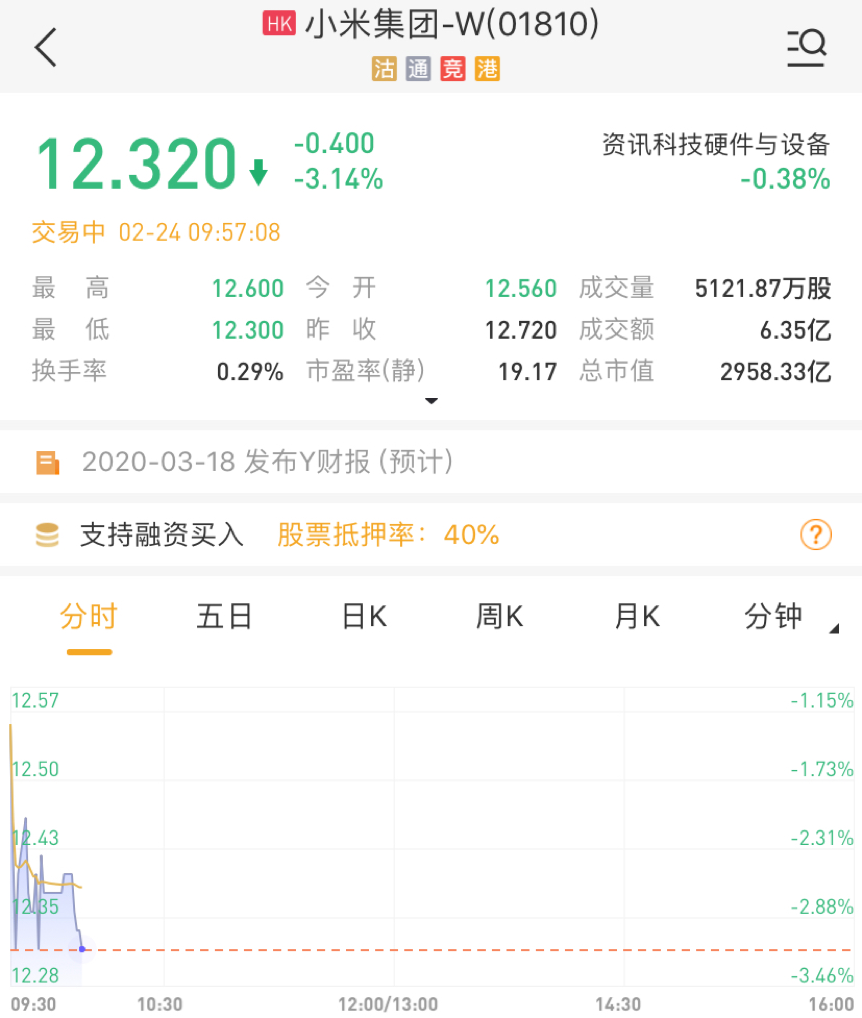 华盛资讯2月24日讯,小米集团(01810)开盘大跌。截至发稿,小米集团大跌3.14%,现报12.32港元每股,当前成交量5121.87万股,成交额达6.35亿港元,换手率为0.29%,当前总市值2958.33亿港元。