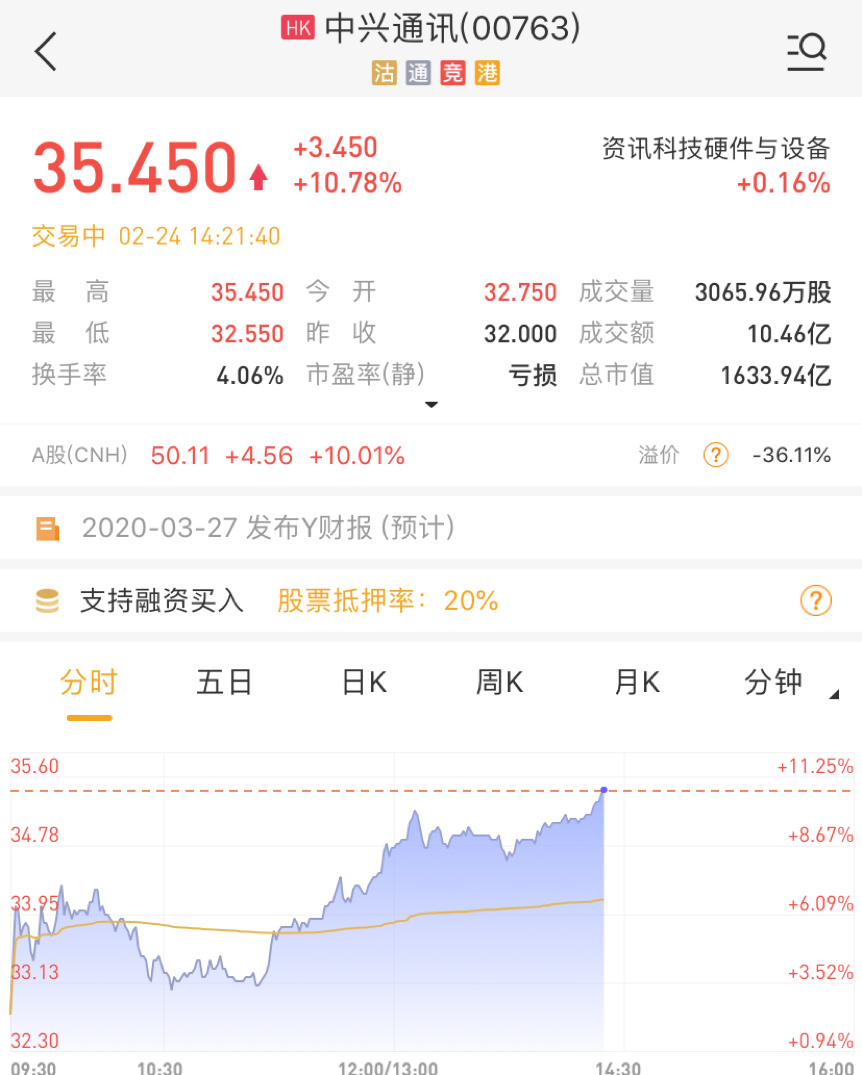华盛资讯2月24日讯,中兴通讯(00763)盘中异动,一度涨超10%。截至发稿,中兴通讯大涨10.78%,现报35.45港元每股,成交量3065.96万股,成交额10.46亿港元,当前换手率4.06%,总市值达1633.94亿港元。