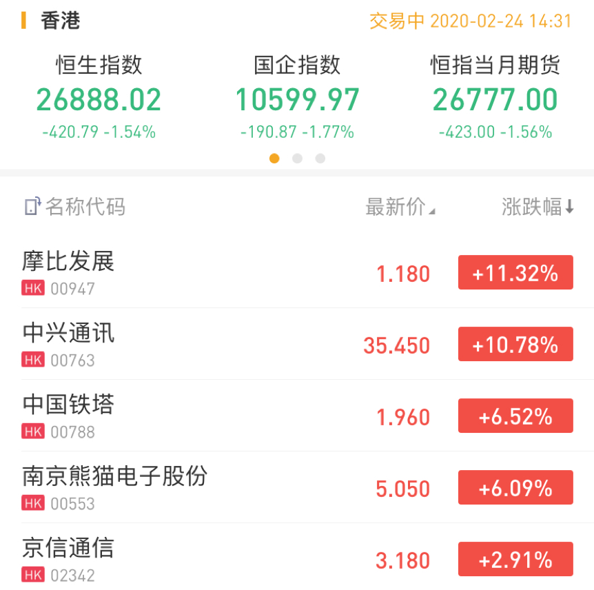 此外,5G概念股亦集体大涨。截至发稿,摩比发展大涨11.32%,报1.18港元;中国铁塔大涨6.52%,报1.96港元;南京熊猫电子股份涨6.09%,现报5.05港元;京信通信涨2.91%,现报3.18港元每股。