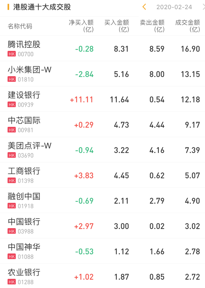 今日净买入建设银行11.11亿港元,净买入工商银行3.83亿港元,净买入中国银行2.97亿港元,净买入农业银行1.02亿港元。