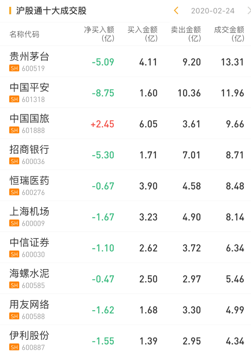 北上资金今日净流入59.55亿元,沪股通净买入中国国旅2.45亿元,净卖出贵州茅台5.09亿元,净卖出中国平安8.75亿元