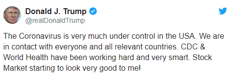 特朗普在社交媒体上先是安抚了投资者焦躁的情绪,他称,“疫情影响在美国已经得到控制,与各方和有关国家都保持着联系。CDC和世界卫生组织一直在努力工作。”然后他说:“股市在我看来开始变得很好了!”