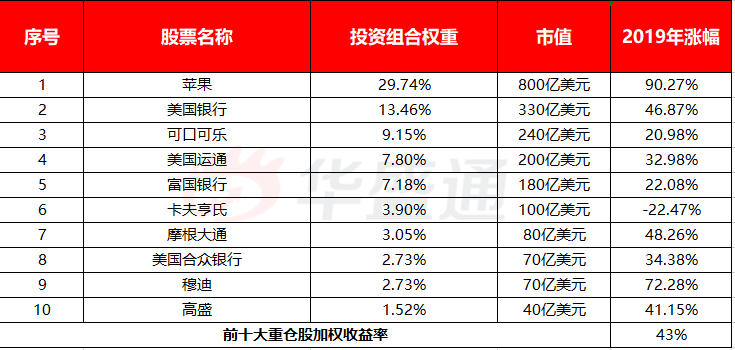 2019年,伯克希尔·哈撒韦投资组合中10个最大的普通股投资一年的加权回报率为43%。这几乎是同期标准普尔500指数上涨23%的两倍。