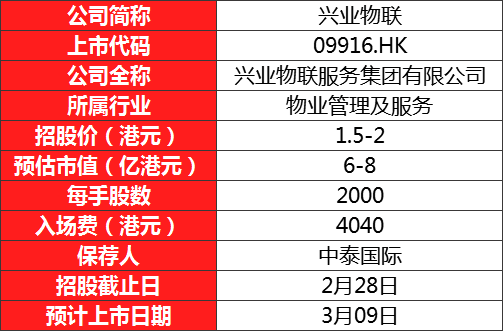 兴业物联服务于2月25日-2月28日招股,公司发行1亿股,其中90%为国际配售,10%为公开发售。另有15%超额配额权;每股发行价1.5-2港元(单位下同);每手2000股,预期3月9日上市。