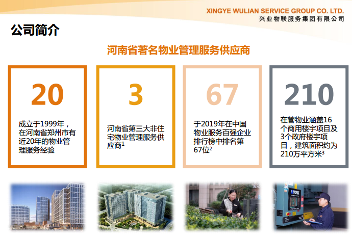 兴业物联服务集团成立于1999年,是河南省的物业管理服务供应商,特别致力于为非住宅物业提供物业管理及增值服务。根据第一太平戴维斯报告,按2018年在管物业建筑面积计算,该公司是河南省第四大非住宅物业管理服务供应商,占2018年河南省市场份额约0.6%。
