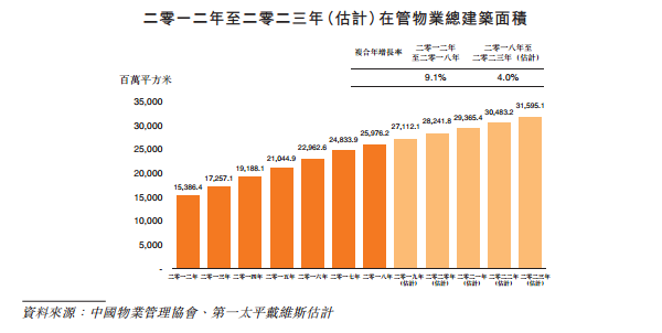 近年来,随着城镇化进程加快、国民生产总值及人均可支配收入不断增加,中国的在管物业总建筑面积快速增加。根据第一太平戴维斯报告,中国在管物业总建筑面积由2012年约153.9亿平方米一直增加,并于2018年达约259.8亿平方米。