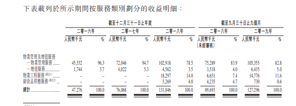 截止2019年前三季度,兴业物联物业管理及增值服务收入占比87.8%、物业工程服务占比11.6%,剩下的0.6%收入来自副食品供应服务。