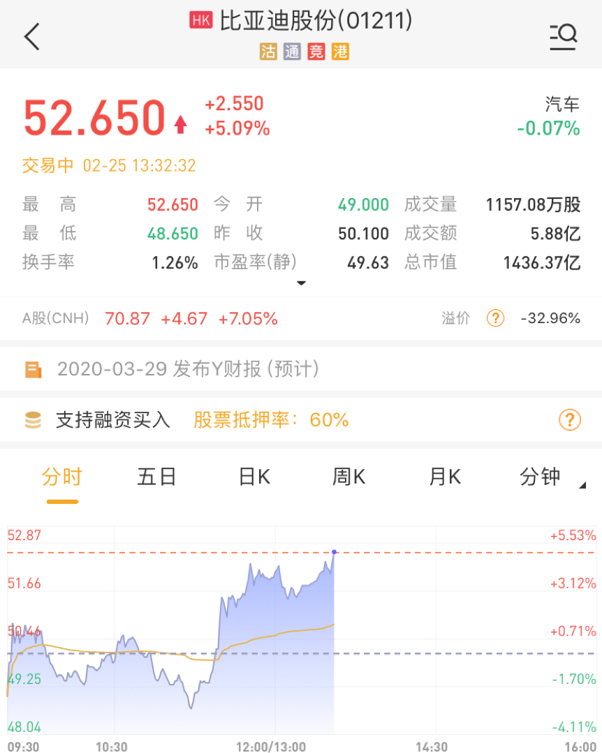 华盛资讯2月25日讯,比亚迪股份(01211)盘中异动,午后大涨逾5%。截至发稿,比亚迪股份大涨5.09%,现报52.65港元每股,当前成交量1157.08万股,成交额5.88亿港元,换手率为1.26%,当前总市值达1436.37亿港元。