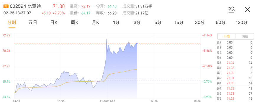 此外,A股比亚迪亦直线大涨,截至发稿涨7.70%,报71.3港元每股。值得注意的是,AH股溢价达32.96%,两地市场存在较大估值差距。