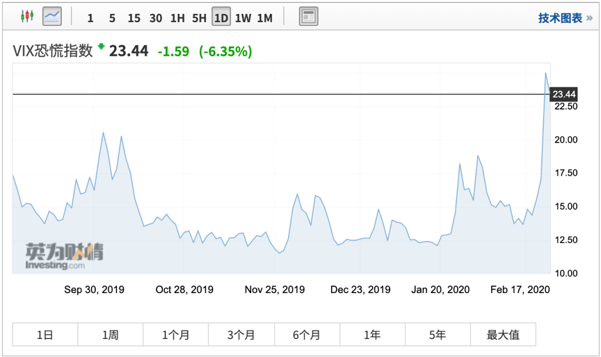 北京时间25日消息,随着对新型冠状病毒疫情的担忧加剧,打击了风险资产,芝加哥期权交易所(Cboe)波动率指数(VIX)周一飙升至一年多以来最高水平,并创下两年来最大涨幅。VIX指数俗称华尔街“恐慌指数”,该指数周一上涨8点,收于25点之上,这是该指数连续第三日上涨,按百分比计算,是有史以来第七大涨幅。截至发稿,VIX指数略有回落,但仍居于高位。