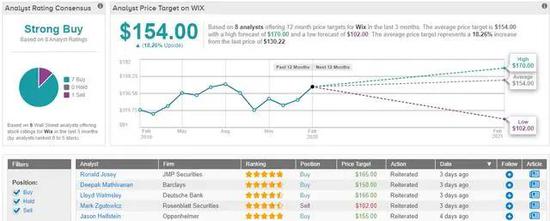 大多数华尔街人士还没有放弃对该公司的投资,TipRanks analytics将WIX视为一个强劲的买入目标。过去3个月调查的8位分析师中,有7位看好该股,只有1位仍持观望态度。该股的普遍目标价为154美元,有可能上涨18%。