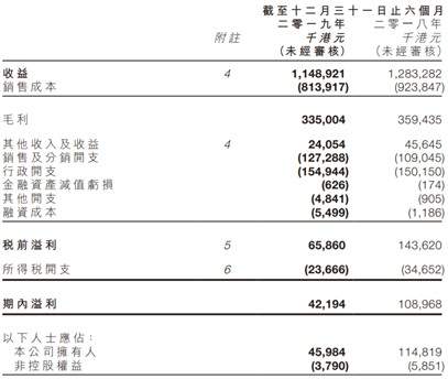 截止2019年末的6个月,公司零售业务录得3.06亿元的对外收入,较去年同期增长36.39%,同时物业投资业务营收同比上涨33.74%至796.3万元,部分缓解了制造业务营收的大幅下滑,使得公司营收规模同比减少10.47%至11.49亿元。而毛利方面,由于营收录得增长的零售业务毛利率较高,使得公司整体毛利率由去年同期的28%增至29.2%,因此3.35亿元毛利仅同比小幅下滑6.8%。