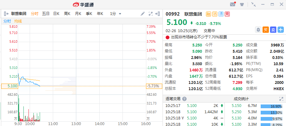 2月26日消息,联想集团(00992.HK)大跌5.36%,开盘跳水一度跌近6%。