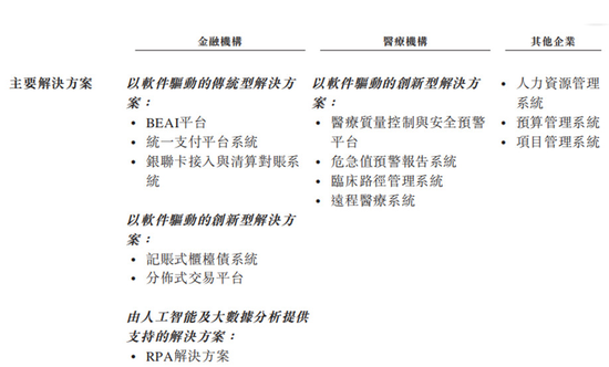 公司还提供了机器人流程自动化解决方案(或RPA解决方案),通过以机器人执行实现流程自动化来取代劳动密集型程序,从而优化金融机构的运营效率。截至2019年9月30日,公司于2018年3月推出的RPA解决方案的部署帮助两家顶级金融机构降低于各种应用场景中的人工成本。灼识报告显示,截至2019年9月30日,我们为中国国内少于十家已成功将RPA解决方案商业化并产生收入的金融机构RPA解决方案提供商之一。