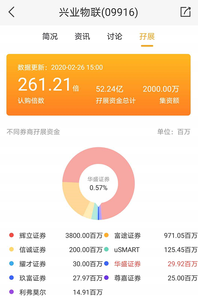 华盛资讯2月26日讯,兴业物联(09916.HK)认购第二天截至15:00,公开发售部分孖展倍数达261.21倍,随时突破300倍,辉立、华盛等券商共计为其借出52.24亿港元。当前距离认购结束还有不到2天。