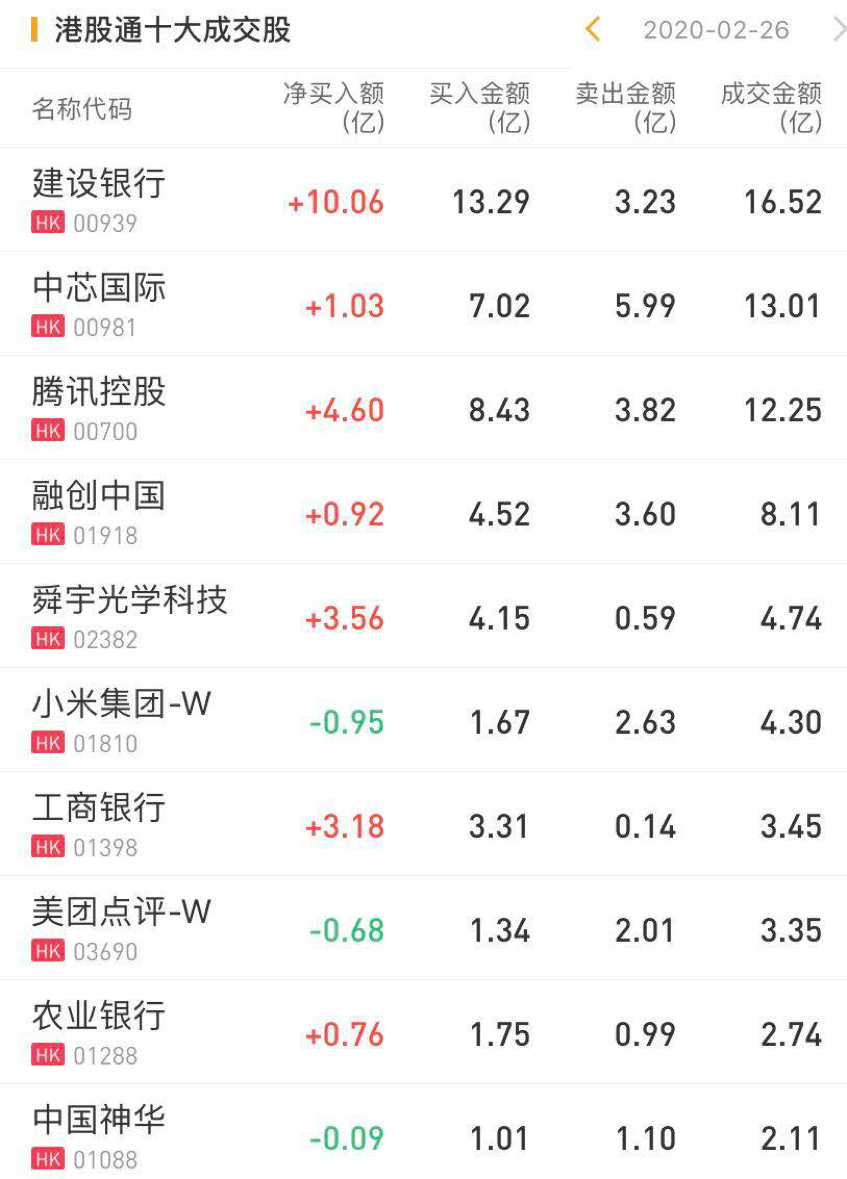 今日净买入腾讯控股4.60亿港元,净买入建设银行10.06亿港元,净买入舜宇光学科技3.56亿港元,净买入中芯国际1.03亿港元。